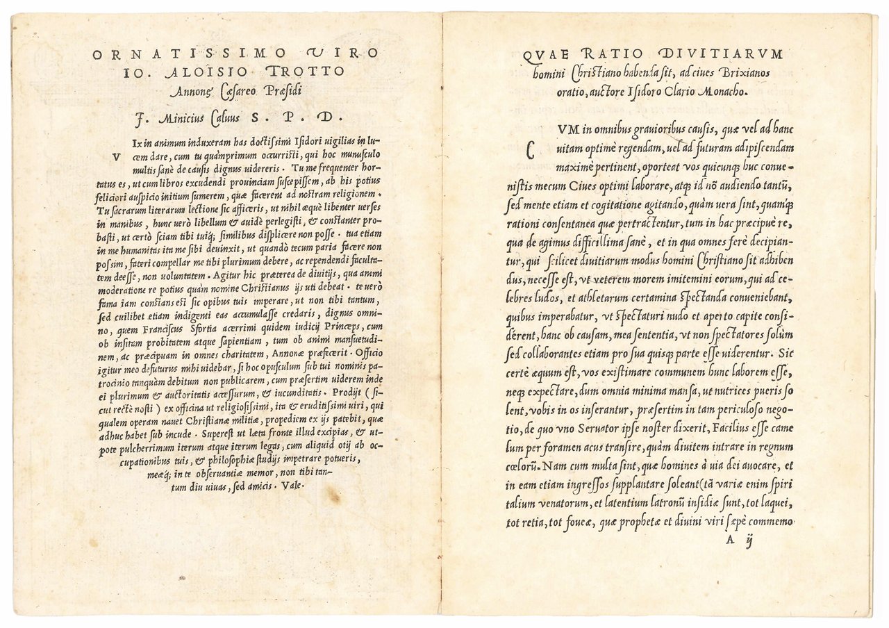 First edition, dedicated by Calvo to Giovanni Luigi Trotti, president of the imperial annona. The oration was reprinted in Isidori Clarii Epistolae ad Amicos (Modena, 1545, pp. 233-285).
