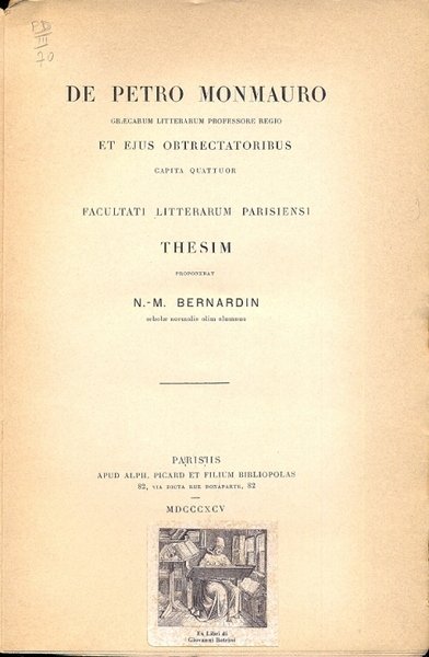 De Petro Monmauro , graecarum litterarum professore regio et ejus obtrectatoribus capita quattuor facultati litterarum parisiensi Thesim. | Libri antichi e moderni | Bernardin M.