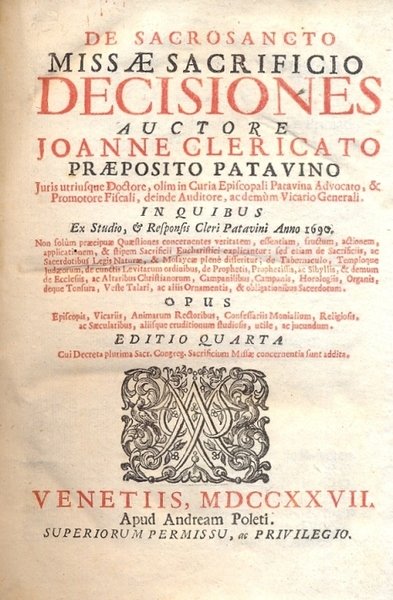 De Sacrosancto Missae Sacrificio Decisiones. In quibus ex studio & responsis Cleri Patavini Anno 1690. Non solum praecipuae Quaestiones concernentes veritatem, essentiam, fructum, actionem, applicationem, & stipem Sacrificii Eucharistici Explicatur: sed etiam de Sacrificii Eucharistici Exèplicatur : sed etiam de Sacrificiis, ac Sacerdotibus Legis Naturae, & Mosaicae plenè differitur: de Tabernaculo, Temploque.Opus Episcopis, Vicariis, Animarum Ractoribus. | Libri antichi e moderni | Clericato Joanne.