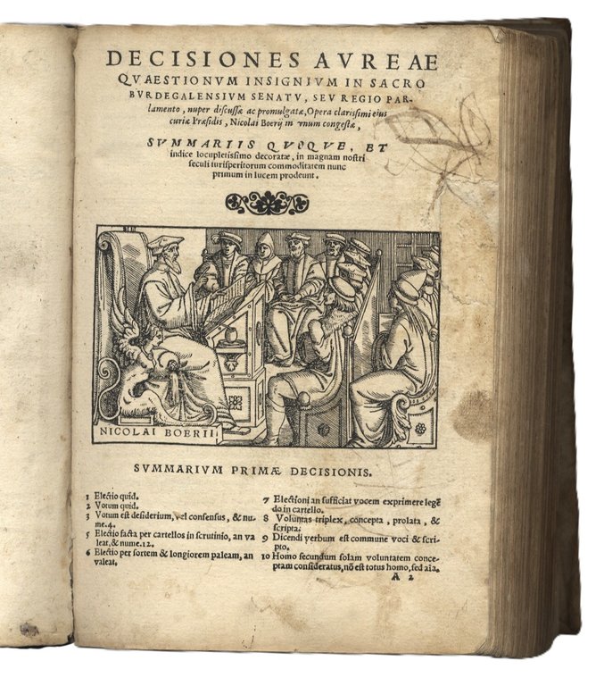 >in-8, ff. 304, legatura coeva p. perg. molle (restaurata al dorso). Impresa tipogr. sul tit., testo su due colonne in minuto car. tondo. Sotto il titolo bel legno (mm 60x98) raffigurante l'autore, presidente del Parlamento di Bordeaux in cattedra davanti ad un folto gruppo di senatori. Probabile prima edizione (nessuna bibliografia, infatti, riporta edizioni precedenti alla presente) della prima parte di questo vasto testo del grande giurista Nicolas Bohier (1469-1539) che comprende ben 218 ''decisiones'' prese dal Senato di Bordeaux rispetto ad altrettante ''quaestiones'' inerenti i comportamenti morali, civili e religiosi del popolo. Furono chiamate ''decisiones burdegalenses'' in quanto Luigi XI stabilì a Bordeaux il Parlamento di Guienne e le restituì una parte dei suoi privilegi goduti precedentemente quando era capitale dei possedimenti inglesi in Francia. Buon esemplare (rinforzati i primi 2 ff., lieve alone in fine al vol.). Non citato da Brunet né Graesse. Adams, BMC French e Baudrier registrano ediz. poster.