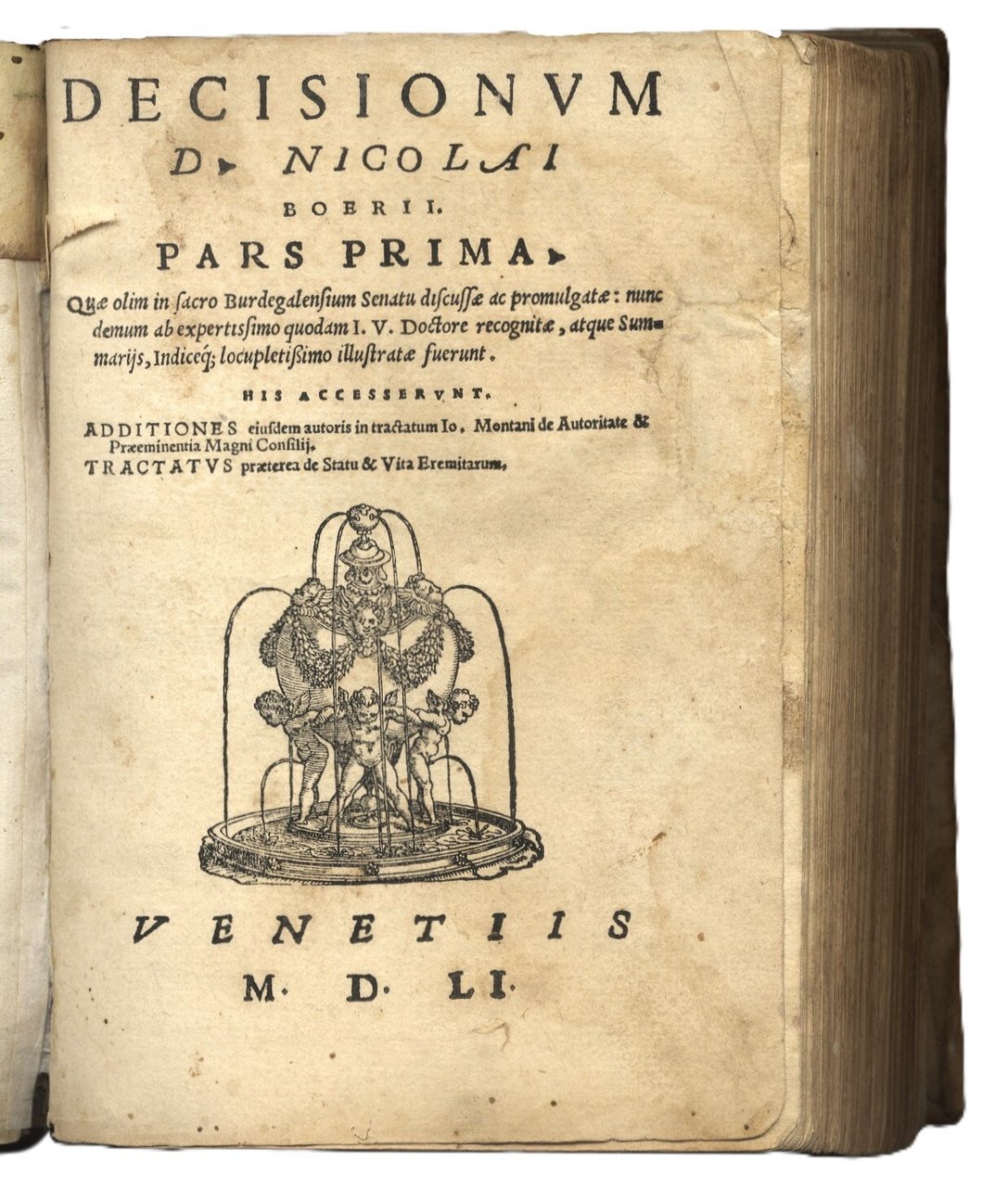 Decisionum Pars prima, quae olim in sacro Burdegalensium Senatu discussae ac promulgatae... His accesserunt Additiones iusdem autoris in tractatum Io. Montani De auctoritate et praeminentia Magni Consilij. Tractatus praeterea De statu et vita Eremitarum.  | Libri antichi e moderni | BOERIUS, Nicolaus.