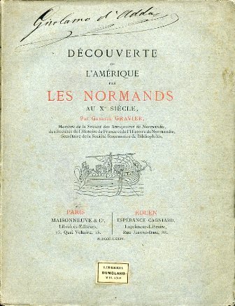 In-8°, pp. XXXIX, 250, (4), brossura editoriale con titolo in rosso e nero, vignetta con imbarcazione normanna e firma di possesso del tempo del famoso bibliofilo, bibliografo e bibliotecario Girolamo d'Adda (Milano, 1815-ivi, 1881), autore, fra l'altro, di importanti monografie come Leonardo da Vinci e la sua libreria (1873) e Indagini storiche, artistiche e bibliografiche sulla libreria Viscontea-Sforzesca del Castello di Pavia (1875). Una tav. su doppia pag. di petroglifi (Dighton Writing Rock) e 3 carte geografiche f.t. a pag. intera o su doppia pag. (carta delle scoperte fatte dai Normanni nelle regioni artiche dell'America, carta a due colori del Vinland (nome che i Vichinghi dettero alla porzione di America settentrionale, oggi nota come Terranova), carta della Groenlandia, dell'Islanda e di parte della Scandinavia. Etichetta del tempo della libreria Dumolard di Milano. Bell'esemplare in barbe. Prima e unica edizione di questo bello studio storico-archeologico confermante lo sbarco dei Vichinghi sulle coste del Nord America, fra i primi sistematicamente dedicati all'argomento. Nel volume ha larga parte anche la storia delle esplorazioni antiche in Islanda e Groenlandia. Il Gravier (Sancoins, 1827-Rouen, 1904), storico, geografo e cartografo, autore della prima mappa moderna e scientifica del Madagascar, fu membro della Société des Antiquaires de Normandie, della Société d'Histoire de France e della Société d'Histoire de Normandie, nonché Segretario della Société Rouennaise de Bibliophiles.