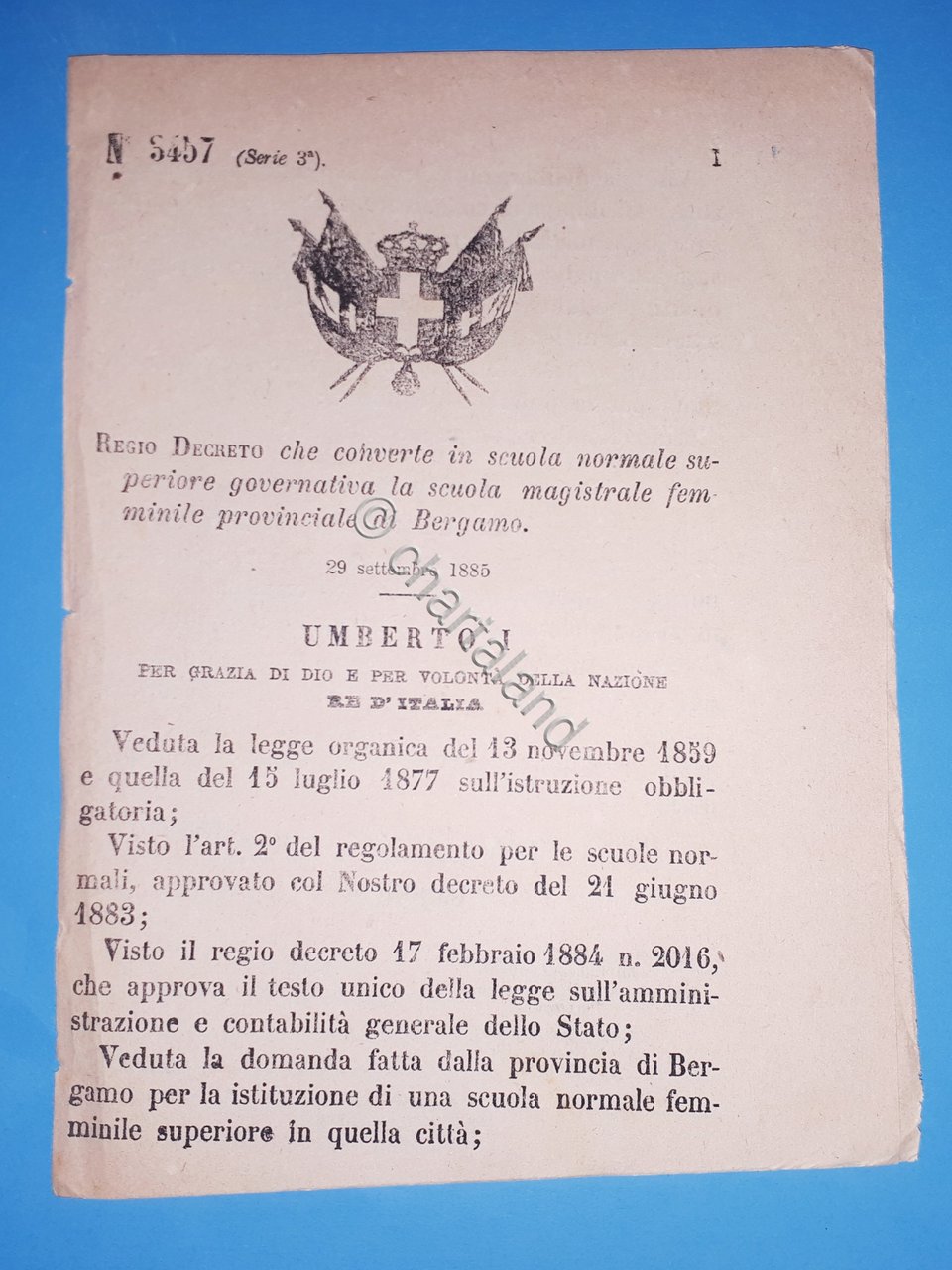 Decreto Regno Italia - Converte scuola magistrale femminile di Bergamo - 1885 | Libri antichi e moderni |
