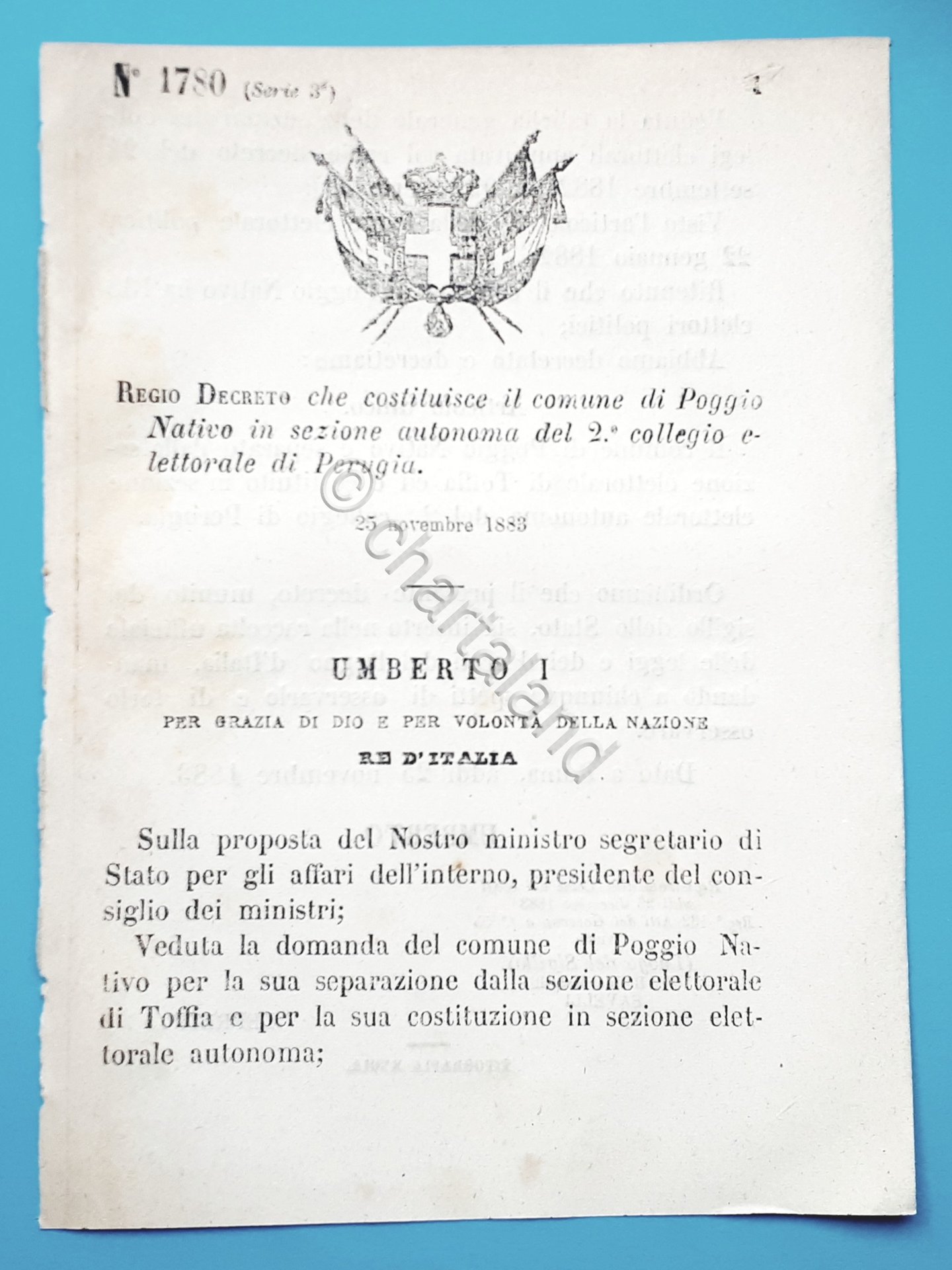 Decreto Regno Italia Costituzione comune Poggio Nativo in sezione Perugia 1883 | Libri antichi e moderni |