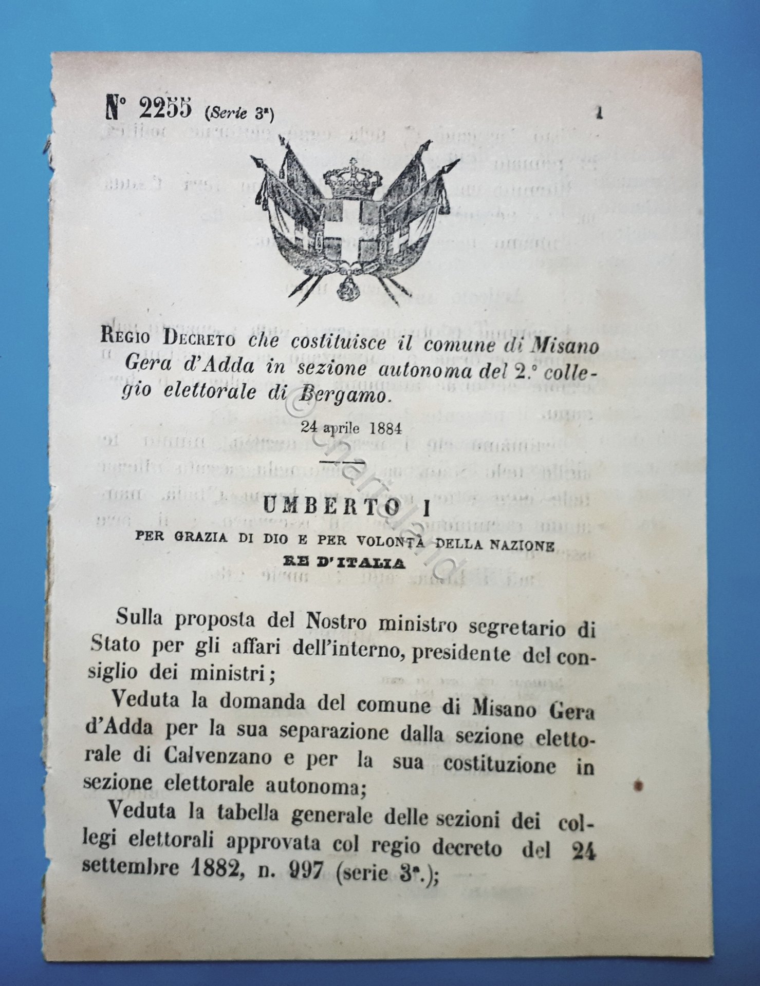 Decreto Regno Italia Costituzione Misano Gera d'Adda in sezione di Bergamo 1884