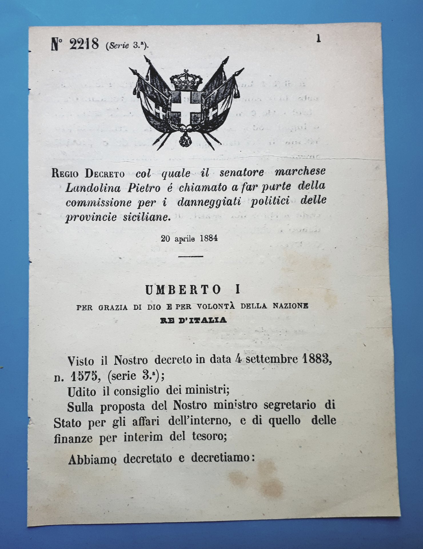 Regio Decreto col quale il senatore marchese Landolina Pietro è chiamato a far parte della commissione per i danneggiati politici delle provincie siciliane. Decreto № 2218 20 aprile 1884 - Pagine 2 Condizioni buone come da foto