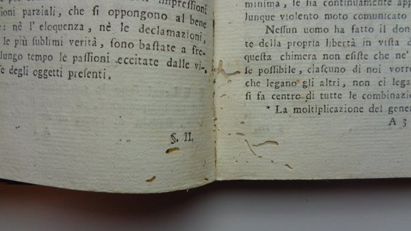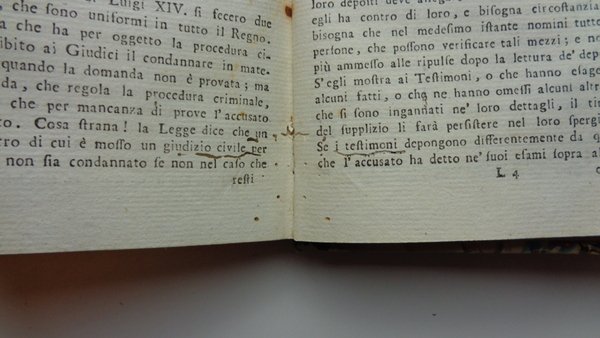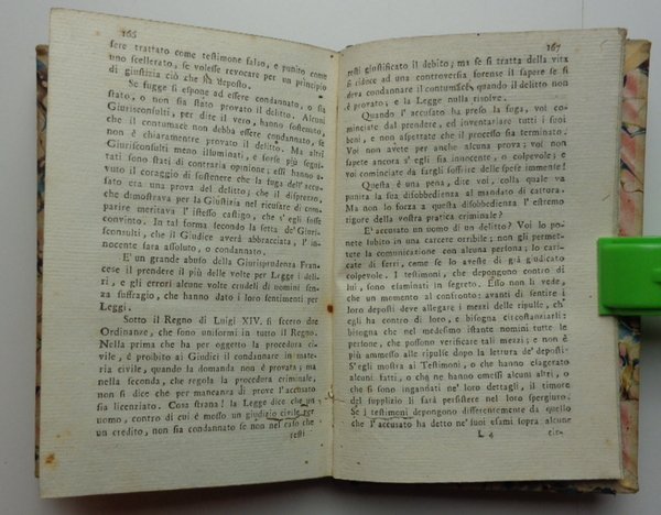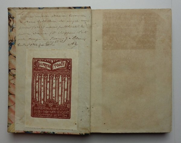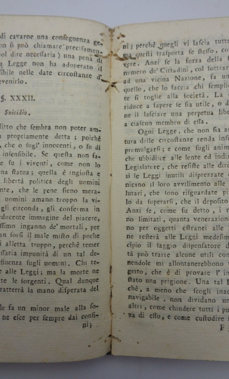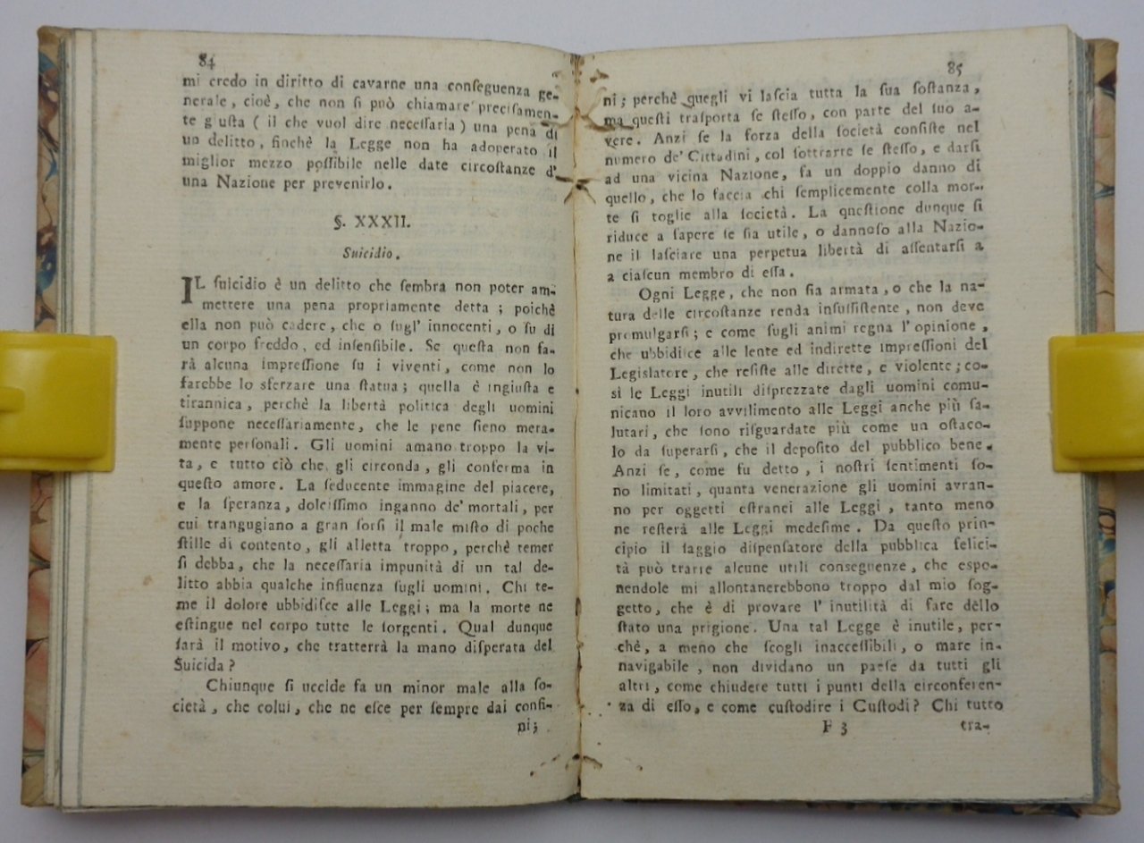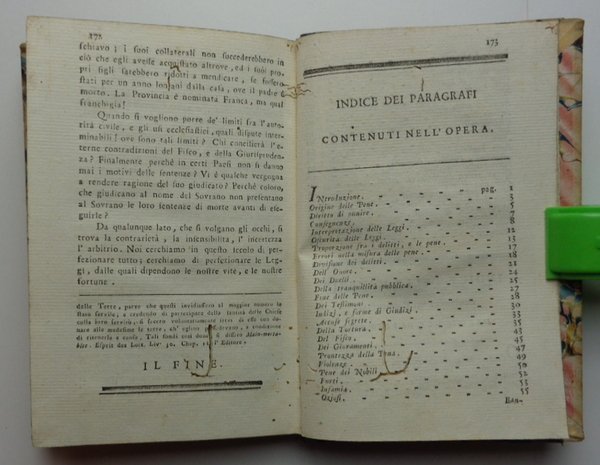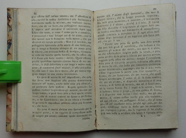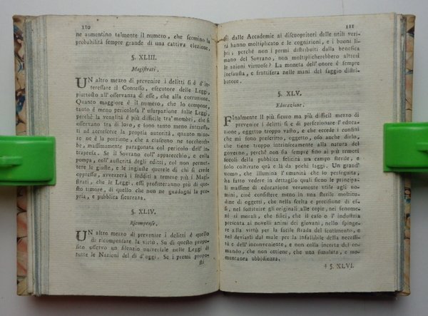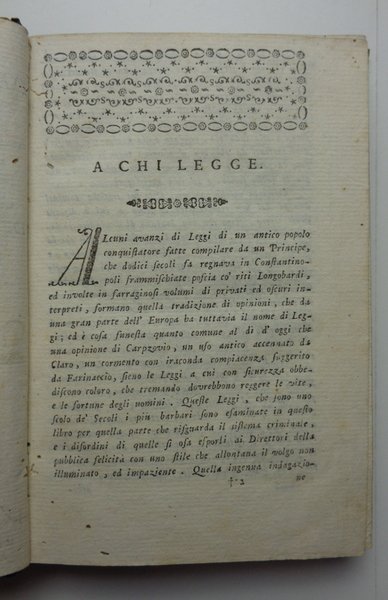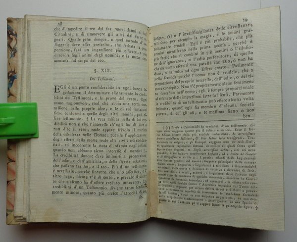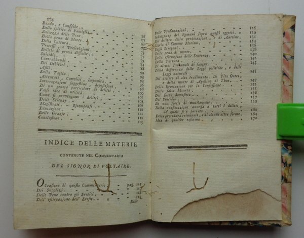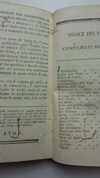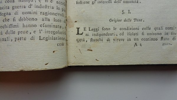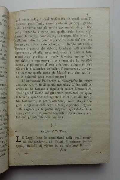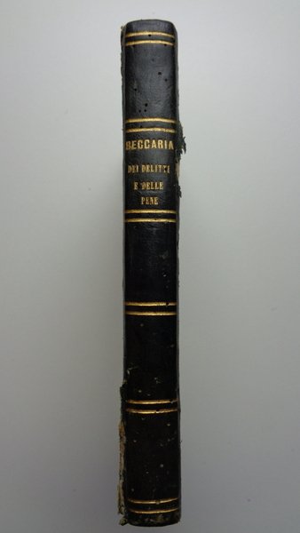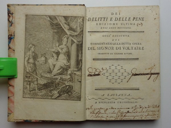 Un volume (12x18 cm) di VII (1) 175 pagine. Vignetta in antiporta. Firma di possesso biffata e note a penna dell epoca sulla pagina di titolo e al termine della presentazione, che fanno riferimento all'Autore e ad un'altra edizione dell'opera. Ex libris Alfredo Toaff al retro del piatto, con sua nota manoscritta sull'edizione del volume. Legatura ottocentesca in mezza pelle verde (mancanze alle cerniere) con piatti con carta marmorizzata. Numerosi fori di tarlo, alcuni restaurati, nella parte bianca di diverse pagine; alla fine toccano purtroppo anche alcune lettere del testo. Mancanza senza perdite alla pagina finale. Prima edizione italiana a contenere il commentario di Voltaire. Il volume, voluto dall'Aubert, venne stampato da Coltellini a Livorno: di questa edizione e della sua importanza parla a lungo Luigi Firpo nelle "Edizioni italiane del Dei delitti e delle pene", pag. 503-506.