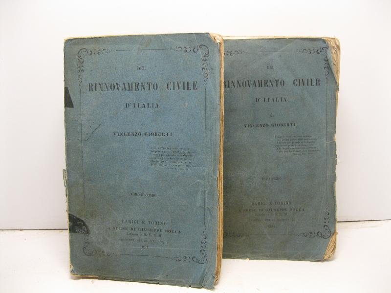 2 voll. in 16, pp. XVII + 540; 612. Danni rip. ai d. Diffuse bruniture. Br. ed. Edizione originale. Una delle principali opere di Gioberti che riflette la disillusione dell'A. in relazione alla volonta' riformista di Pio IX, e il fallimento del suo programma neo-guelfo. In essa proponeva un nuovo programma politico, che in parte anticipava quello di Cavour, riconoscendo il primato dei principi sabaudi, che avevano il compito storico di ricondurre all'unita' gli Stati italiani.