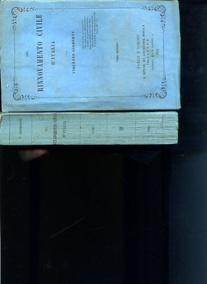 2 voll. in-8° (185x115mm), pp. (4), XVII, (3), 540; (4), 612; brossura editoriale azzurra con titolo entro filetto con fregi accantonati. Lievi gore al piatto anteriore del primo vol. Timbri del tempo della Libreria della Minerva Subalpina di Torino. Ottima copia intonsa. Edizione originale di una delle più significative opere giobertiane, suo avvicinamento alle posizioni unitarie sabaude e insieme severa critica del potere temporale pontificio, non più considerato come il motore dell'Unità italiana. 'Nel Rinnovamento civile d'Italia il Gioberti non è più neoguelfo, ma liberale nel miglior senso della parola. All'ideale federale è sostituito quello unitario; e il Piemonte sarà ora il fulcro dell'unità italiana. E Roma sarà il centro d'uno Stato unitario laico, formatosi per mezzo della progressiva egemonia piemontese, faro di civiltà e di libertà ai popoli: Roma resterà ugualmente sede del Papato, ma la forza e grandezza di questo non sarà che nel campo spirituale' (Rosi, III, 229). L'opera conobbe immensa eco nel dibattito risorgimentale e fu letta con estremo interesse da Cavour e da Vittorio Emanuele II, che ne commentà alcune parti. I duri giudizi formulati da Gioberti contro i principali attori della scena politica italiana suscitarono un vespaio di critiche, soprattutto da parte di Mazzini e, sul fronte clericale, della Compagnia di Gesù. Tuttavia, il programma politico prospettato dal filosofo torinese costituì una valida fonte di ispirazione per la politica piemontese a cavallo tra la Prima e la Seconda Guerra d'Indipendenza. Parenti, Prime edizioni, p. 263.