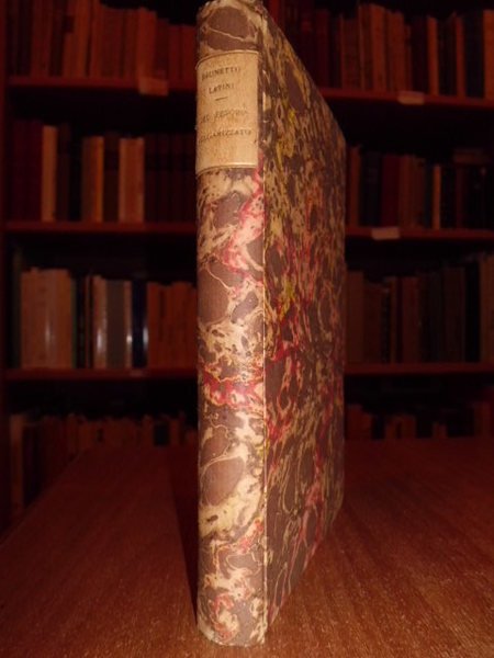 (Curiosità letterarie inedite o rare). Del Tesoro volgarizzato.Libro primo edito sul più antico dei codici noti raffrontato con più altri e col testo originale francese da Roberto Visiani. LATINI, Brunetto. Bologna, Gaetano Romagnoli, 1860. In - 16°, cartone marmorizzato con tassello al dorso, copertine originali conservate. 208, (2) pp. Alcuni segni e postille a penna. Edizione di soli 202 esemplari (es. n° 174). Ottimamente conservato. Uff. scat. 6