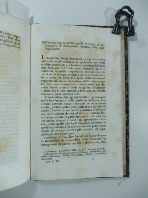 In 8, cm 13 x 20, pp. 16 (da p. 225 a p. 240). Brossura rifatta. Stralcio dal Nuovo giornale de' letterati. Pisa. recensione di quest'opera di Mario Musumeci, pubblicata a Catania nel 1829 e dedicata alla fabbricazione della carta