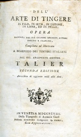 In-8° (200x125mm), pp. XVI, 320, legatura coeva m. pelle e angoli con fregi vegetali in oro e titolo in oro su tassello al dorso. Piatti marmorizzati. Tagli in marmorizzatura rossa. Piccolo fregio al titolo. Dedica a stampa dell'autore al cavalier Girolamo Giuliani. Qualche usuale fioritura. Seconda e accresciuta edizione di questo fortunato manuale tintorio apparso per la prima volta nel 1793. L'opera riprende compilazioni precedenti inglesi e francesi e le rielabora ad uso dei tintori italiani, con numerosi accorgimenti per tingere la seta, il cotone, la lana e la pelle nei più svariati colori, alcuni dei quali oggi rari e inconsueti (il rosso di Andrinopoli, il verde anitra, il porpora di Cassio, il violetto del Brasile, ecc.). Il Talier era arciprete di Campo di Pietra, presso Treviso; a lui si deve altresì una Dissertazione. sopra le cagioni del deterioramento delle razze degli animali, e sopra i mezzi di migliorarle (1792).