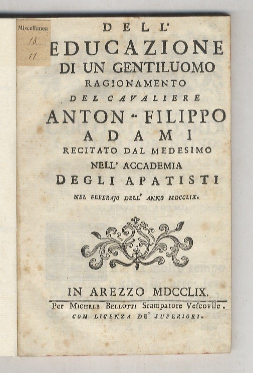Dell'educazione di un gentiluomo. Ragionamento del cavaliere Anton-Filippo Adami recitato dal medesimo nell'Accademia degli Apatisti nel febbrajo dell'anno MDCCLIX. | Libri antichi e moderni | Adami Anton Filippo.