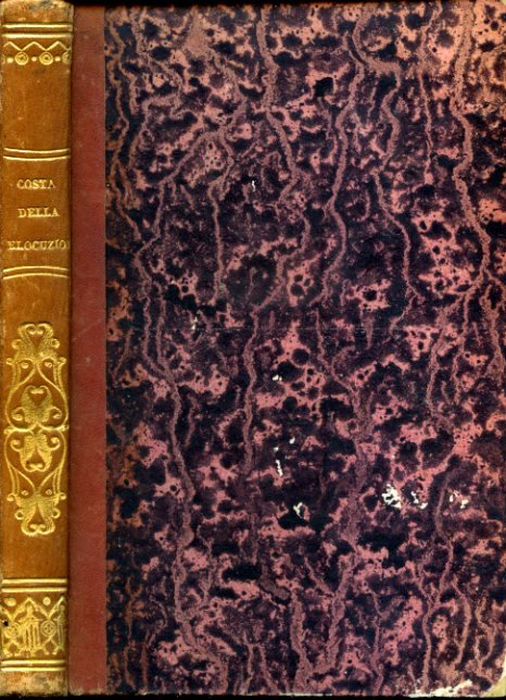 In-16°, pp. 162, legatura del tempo m. pelle con titolo e fregi in oro al dorso. Piatti marmorizzati. Tagli a spruzzo. Bell'esemplare. Una firma ottocentesca. Edizione originale di questo trattato sull'eloquenza e l'arte del bello scrivere. Paolo Costa (Ravenna, 1771-Bologna, 1836), poeta, filosofo sensista seguace di Condillac, letterato di orientamento neoclassico ed esegeta dantesco, studiò prima nella città natia e poi a Padova, sotto Melchiorre Cesarotti e Simone Stratico. Interrotti gli studi con l’arrivo dei Francesi, svolse incarichi pubblici a Ravenna e a Bologna e, durante il Regno d’Italia, ottenne la cattedra di filosofia nel liceo di Treviso prima e in quello di Bologna poi. Soppresso il liceo pubblico dalla Restaurazione, nel 1822 si dette all’insegnamento privato nella sua villa bolognese, protraendolo fino al 1831, quando venne costretto a riparare a Corfù perché sospettato di essere affiliato alla carboneria. Rientrò definitivamente a Bologna nel 1832.