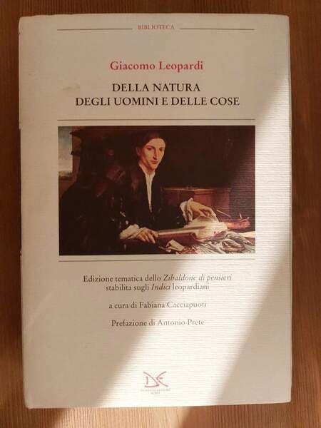 Legatura in cartone, sopraccoperta illustrata, cm. 17,6 x 12, pp.LXXXIV-380. Edizione tematica dello Zibaldone di pensieri stabilita sugli Indici leopardiani a cura di Fabiana Cacciapuoti. Prefazione di Antonio Prete.