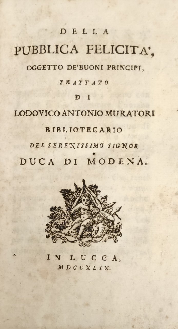 Ed. coeva alle altre stampate nel medesimo anno, il 1749: in quell'anno il Muratori scrisse questa sua ultima opera. Nella "Pubblica Felicità" vengono esplorati i concetti di «privato Bene» e di «Ben Pubblico o sia della Pubblica Felicità, [...] di gran merito [...] presso Dio e presso gli Uomini». Nella trattazione viene rimarcata l'idea che debba essere il «bonus Princeps» a prendersi cura del Pubblico Bene e si elencano gli ambiti in cui esso possa effettivamente agire.