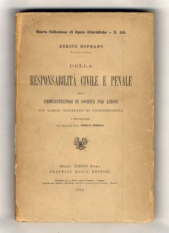 Della responsabilità civile e penale degli amministratori di Società per Azioni, con larghi massimarii di Giurisprudenza e prefazione del senatore Prof. Enrico Pessina. | Libri antichi e moderni | Soprano Enrico.