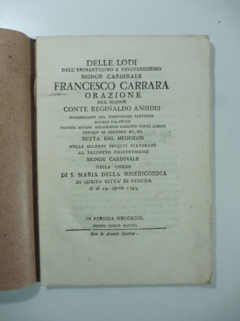 Delle lodi dell'eminentissimo e reverendissimo Signor cardinale Francesco Carrara. Orazione nella Chiesa di S. Maria della Misericordia di questa citta' di Perugia | Libri antichi e moderni | Reginaldo Ansidei
