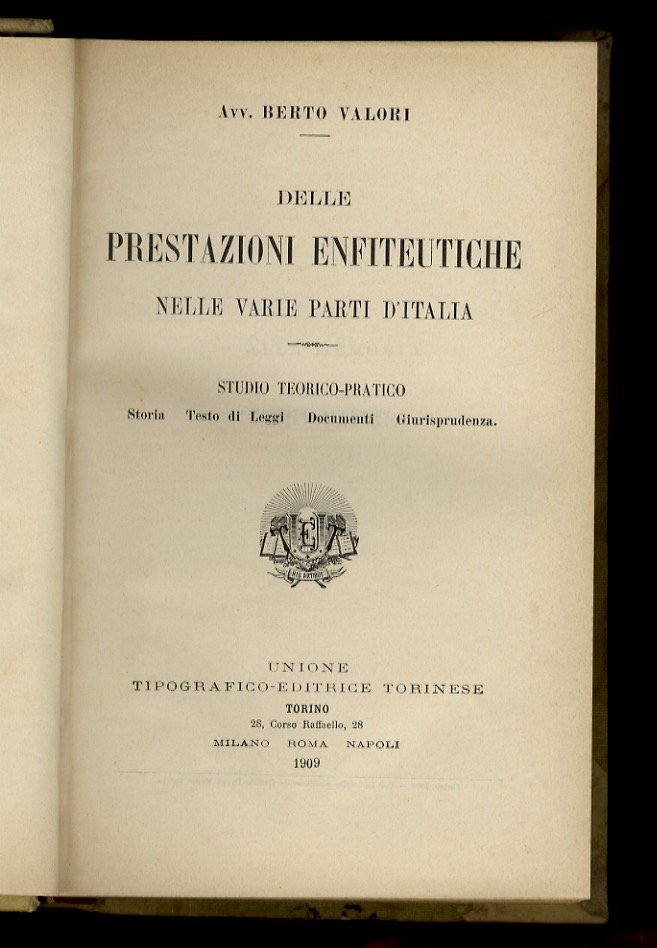 Delle prestazioni enfiteutiche nelle varie parti d'Italia. Studio teorico-pratico. Storia. Testo di leggi. Documenti. Giurisprudenza. | Libri antichi e moderni | Valori Berto.