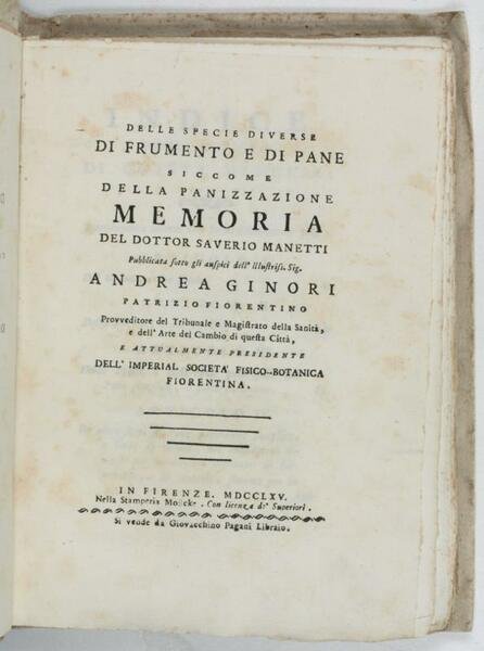 Delle specie diverse di frumento e di pane siccome della panizzazione. | Libri antichi e moderni | Manetti, Saverio.