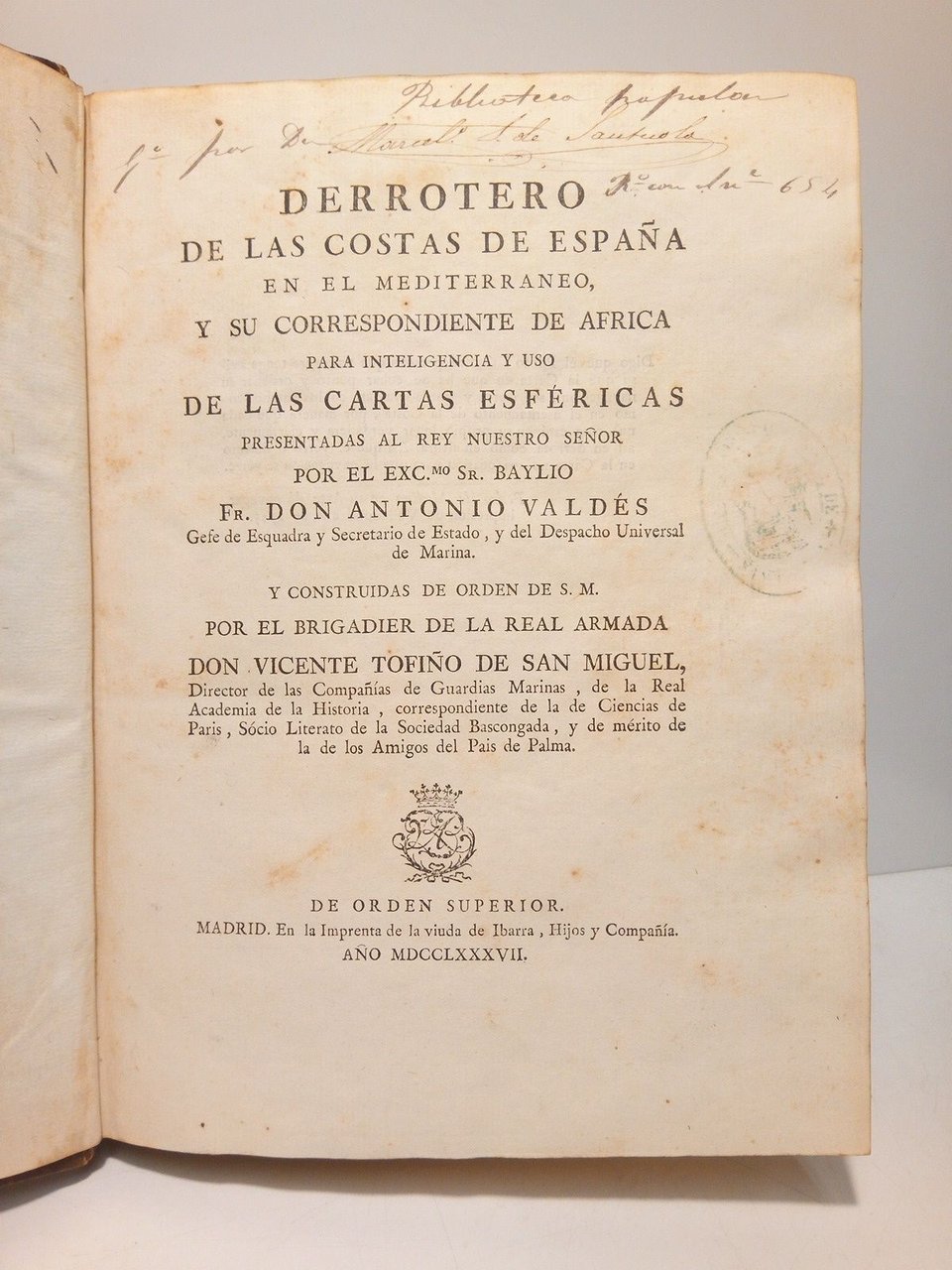 Derrotero de las costas de España en el Mediterraneo, y su correspondiente de Africa para inteligencia y uso de las cartas esféricas presentadas al Rey Nuestro Señor, por el Excmo. Sr. Baylio Fr. Don Antonio Valdés, Gefe de la Esquadra y Secretario de Estado, y del Despacho Universal de Marina / Y construiodas de orden de S. M. por el Brigadier de la Real Armada Don Vicente Tofiño de San Miguel [incluye una amplia introducción no firmada de LVIII pags. de D. José de Vargas Ponce, según indica Palau]