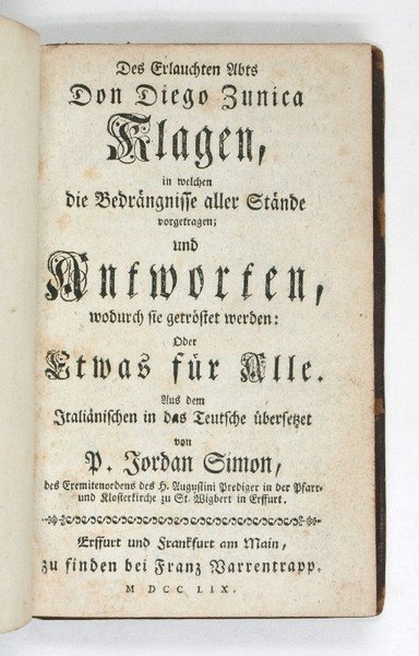 Des Erlauchten Abts Don Diego Zunica Klagen, in welchen die Bedrängnisse aller Stände vorgetragen; und Antworten, wodurch sie getröstet werden: Oder Etwas für Alle. Aus dem Italiänischen ins das Teutsche übersetzet von P. Jordan Simon, des Eremitenordens des H. Augustini Prediger in der Pfarr- und Klosterkirche zu St. Wigbert in Erffurt.