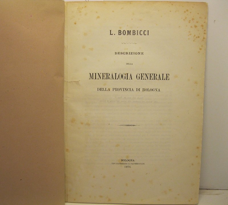 In 4, pp. 85 + (1b). Usuali fioriture alle carte. Brossura muta coeva. Solo la prima parte, in edizione originale, di questo interessante studio di Bombicci contenente il catalogo mineralogico del Bolognese. La seconda parte, con piccole illustrazioni intercalate al testo, venne pubblicata l'anno successivo, nel 1874.