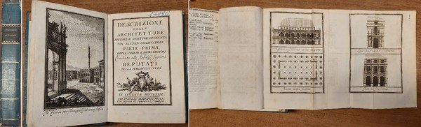 2 parti in un vol. in-16, pp. XXIV, 144, (2), 3; 136, (2), 7, leg. alla bodoniana in cartone rigido azzurro e tass. al d., tagli color. Segnalibro conservato. Antip. magistralmente inc. in rame da Dall’Acqua e 10 tavv. ripp. in rame raffiguranti spaccati e prospetti di palazzi. Rara guida della città scritta dall’A. assieme a Baldarini. Noto autore di scritti di architettura teatrale, l’Arnaldi (Vicenza 1716-1794) difese a lungo la tradizione palladiana a Vicenza. Rumor I, 45.4. Melzi I, 286. Ottimo stato di conservazione. [015]