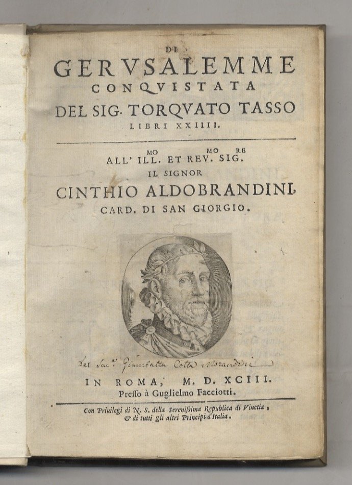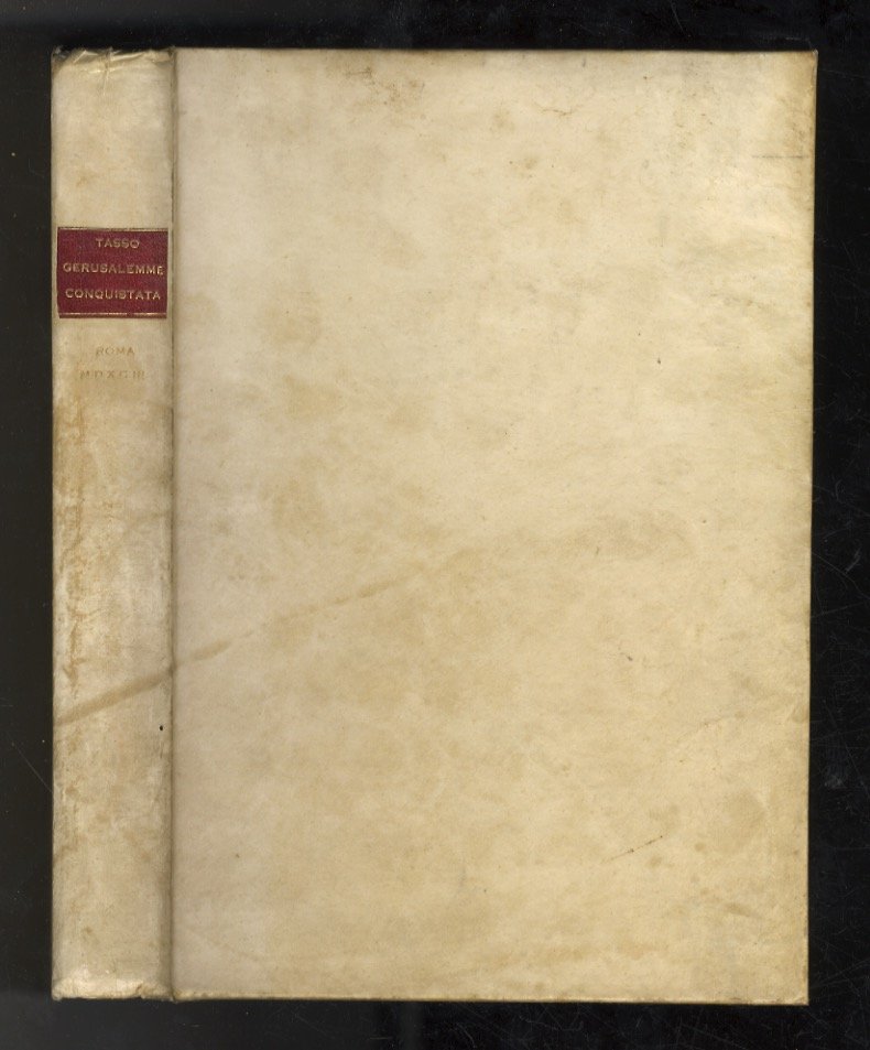 In Roma, presso à Guglielmo Facciotti, 1593, in-4, legatura ottocentesca in piena pergamena, titolo in oro su tassello di pelle al dorso, pp. [12], 290, [2]. Con piccolo ritratto del Tasso inciso in rame sul frontespizio. Prima edizione della "Gerusalemme conquistata", la riscrittura "riveduta e corretta" del capolavoro "La Gerusalemme liberata" (che era stato concluso nel 1575 e stampato nel 1581). Tasso vi lavorò dal 1582 al 1593 e la pubblicò a Roma nel 1593 con dedica al cardinale Cinzio Aldobrandini, nipote di papa Clemente VIII e mecenate del poeta negli ultimi anni della sua vita. Con quest’opera Tasso era convinto di aver costruito un poema perfetto, migliore della Liberata (lo chiamava "a mia figlia prediletta"). Buon esemplare.