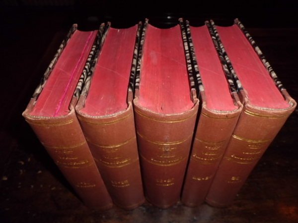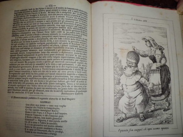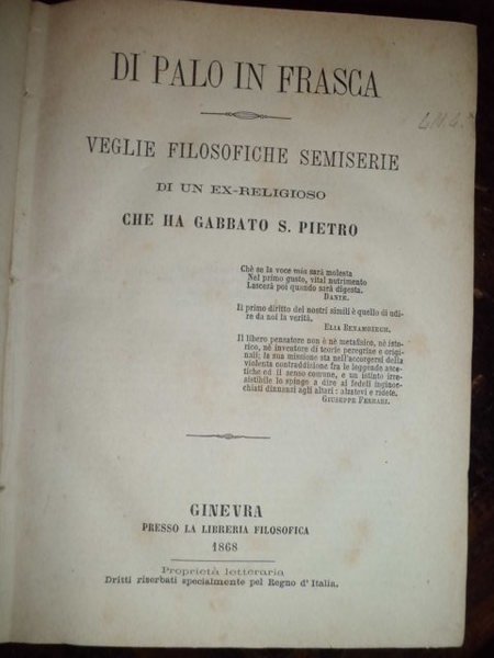Anonimo. Di palo in frasca - Veglie filosofiche semiserie di un ex - religioso che ha gabbato S. Pietro. Ginevra, presso la Libreria Filosofica (ma Firenze, E. Carlo Usigli), 1868 - 1873. 4 volumi in - 8° divisi in 8 parti rilegati in 5 tomi, m.tela. Complessive 3496 pp. con una tavola satirica in litografia. Ottimo esemplare senza difetti. L' opera è una copiosissima critica della religione cattolica, posta all' Indice dei libri proibiti con decreto del Sant' Uffizio del 27 gennaio 1869, confermato dalla Sacra Consulta, che ordinò la distruzione di tutti gli esemplari sequestrati. Raccolta completa molto rara. L' autore è sconosciuto al Passano( Opere anonime). Neg.