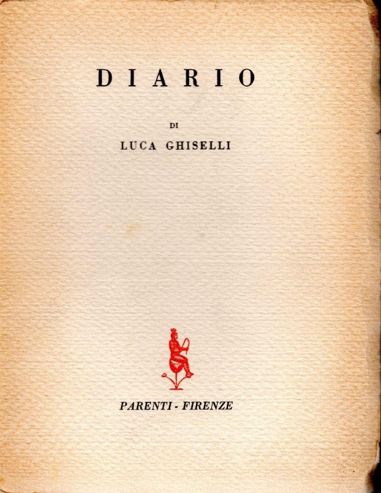 Diario, prima edizione aprile 1942, pp. 187, formato 16 x 21.<BR>Copertina morbida di color crema con titoli in nero e rosso al piatto anteriore e sul dorso.All'interno tavola illustrata con ritratto di Luca Ghiselli eseguito dal pittore Mario Marcucci.Tiratura in 355 esemplari stampati su carta doppio Guinea. Nostra copia n. 170.<BR>Lievi bruniture ai piatti e sul dorso. Ingiallimento delle pagine. Nel complesso Condizioni molto buone.