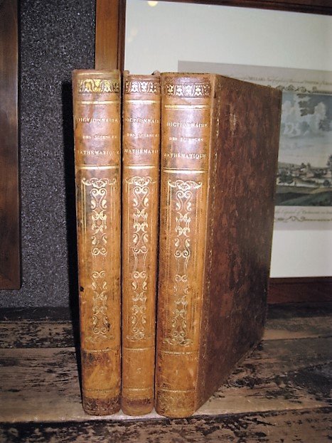 3 volumi in-4° (300x195mm), pp. 620, (3) di errata; VIII, 584; (4), 190, (1) di errata; legatura coeva p. pelle marrone marmorizzata con ricca bordura floreale impressa in oro lungo il perimetro dei piatti. Titolo, filetti e ricchi fregi in oro ai dorsi. Tagli a spruzzo. Sguardie marmorizzate. Testo bicolonne. Complessive 80 tavv. incise in litografia f.t. Numerose figure n.t. Un restauro alla cuffia superiore del secondo vol. Ottimo esemplare. Seconda edizione di questo amplissimo dizionario delle scienze matematiche pure e applicate redatto da uno stuolo di studiosi sotto la supervisione del Montferrier (Parigi, 1792-ivi, 1863), genero di Wronski. 'M. Montferrier, littérateur et mathématicien français, a publié plusieurs ouvrages de mathématiques et un dictionnaire des sciences mathématiques pures et appliquées. Cet ouvrage résume par ordre alphabétique l'histoire de toutes les découvertes scientifiques et leurs applications à l'industrie, ainsi que la biographie des hommes qui ont agrandi le cercle des connaissances positives'. (Hoefer, XXXVI, pp. 247/248). Il terzo volume è di supplemento e contiene numerosi articoli sulla geodesia, la trigonometria e l'astronomia stesi da Puissant.<br>Poggendorff, II, col. 195.