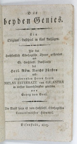 Die beyden Genies. Ein Original-Lustspiel in fünf Aufzügen. Für das Hochfürstlich Esterhazysche Theater geschrieben [.]. Die Musik hiezu ist vom Hochfürstl. Esterhazyschen Concertmeister Hummel.