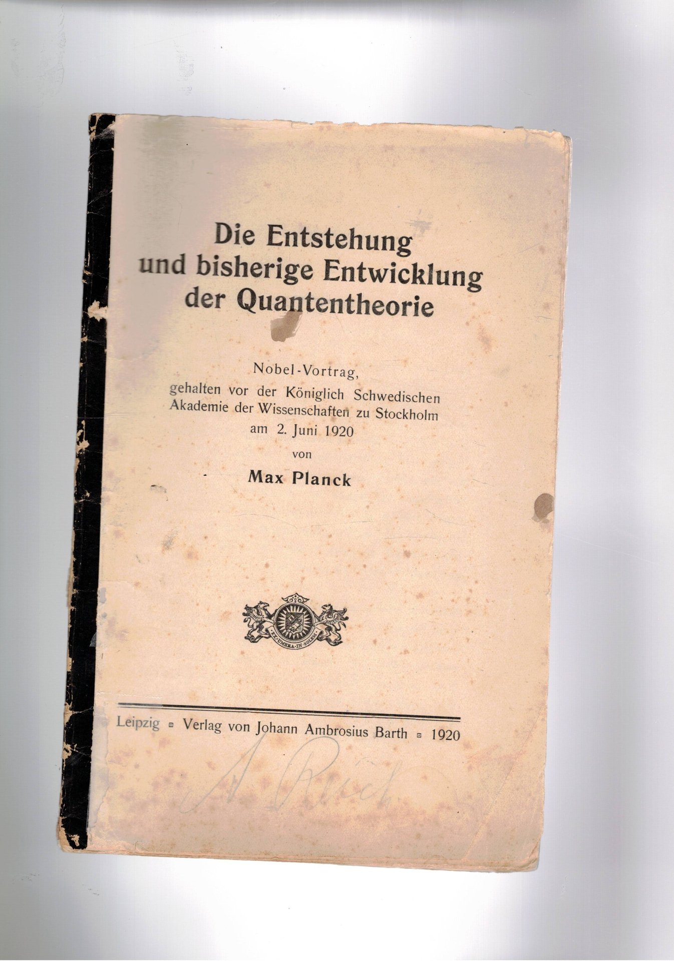 Die Entstehung und bisherige Entwicklung der Quantentheorie. Nobel-Vortrag, gehalten vor der Königlich Schwedischen Akademie der Wissenschaften zu Stockholm am 2. Juni 1920. Prima edizione. | Libri antichi e moderni | Planck Max.