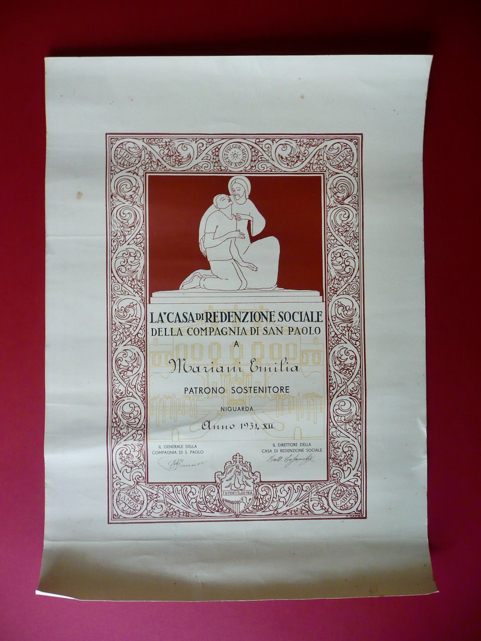 Diploma, La Casa di Redenzione Sociale della Compagnia di San Paolo a Mariani Emilia Patrono Sostenitore Niguarda Anno 1934 Bel diploma a stampa su carta, con ill. e fregi xilografici firmati F. Gamba; sezioni bianche compilate manualmente; presenti firme di convalida. Cm 55x39,5. Condizioni di conservazione Esemplare ben conservato con tracce d'uso, lievi tracce di pieghe di conservazione, margini sup. e inf. con leggere ondulazione, alcune piccole lievi bruniture; angoli inf. con tracce di piccole pieghette. Bella grafica a colori firmata F. Gamba. EXTRA.0128 N