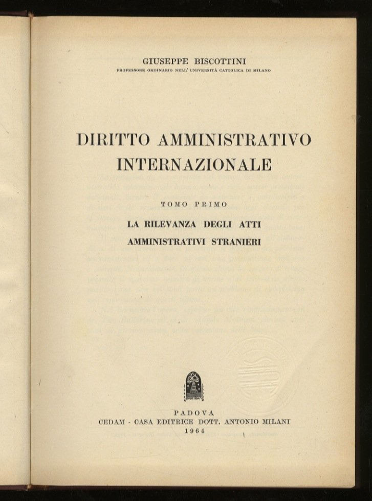 Diritto amministrativo internazionale. La rilevanza degli atti amministrativi stranieri. La circolazione degli uomini e delle cose. | Libri antichi e moderni | Biscottini G.