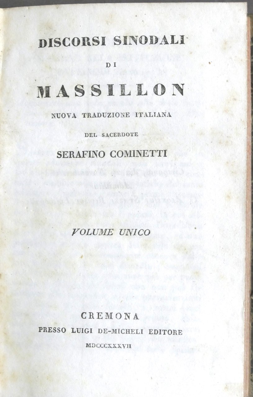 Discorsi sinodali di Massillon Nuova traduzione italiana del sacerdote Serafino Cominetti - Volume unico Cremona, presso Luigi De-Micheli Editore, 1837 Pag. 284 Legatura in mezza pelle - Testo in italiano. Buone condizioni generali.