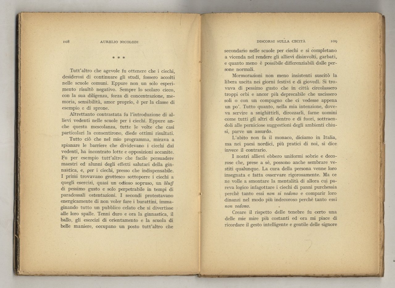 Firenze, "L'Arte della Stampa", 1944, in-8, br. editoriale, pp. 157, [3]. Invio manoscritto sulla prima carta bianca - probabilmente firmato dall'autore che era non vedente. Aurelio Nicolodi (Trento, 1 aprile 1894 – Firenze, 27 ottobre 1950) è stato un educatore ed irredentista italiano, fondatore dell'Unione Italiana Ciechi.