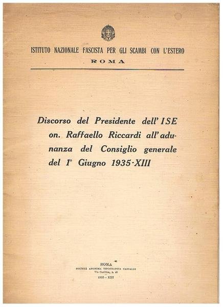 Discorso del presidente dell'Ise on. Raffaello Ricciardi all'adunanza del consiflio generale del 1 giugno 1935 all'istituto nazionale fascista per gli scambi con l'estero.