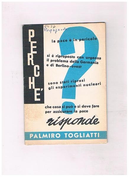 Discorso pronunciato alla Camera dei Deputati dall'on. Palmiro Togliatti, il 27 settembre 1961, in occasione del dibattito sul Bilancio del Minstero degli Esteri. Con una chiara analisi delle cause che sono alla base della crisi internazionale, il Segretario Generale del P.C.I. risponde alle più assillanti domande che si pongono all'opinione pubbli | Libri antichi e moderni | Togliatti Palmiro.