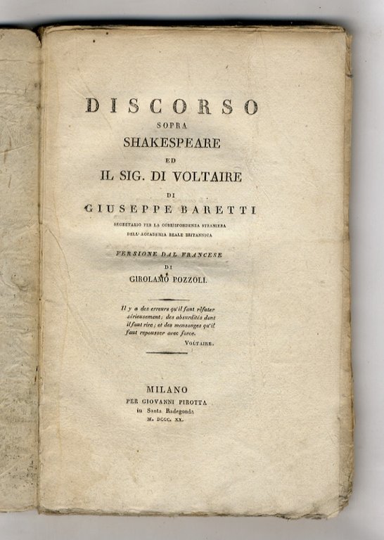 Discorso sopra Shakespeare ed il sig. di Voltaire di Giuseppe Baretti [.] Versione dal francese di Girolamo Pozzoli. | Libri antichi e moderni | Baretti Giuseppe.