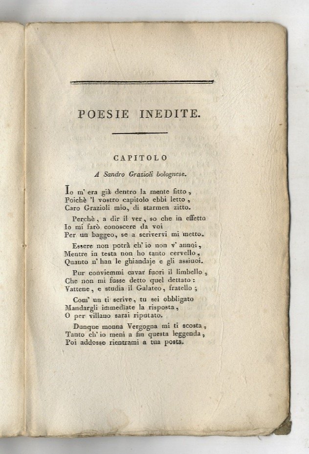 Milano, per Giovanni Pirotta in Santa Radegonda, 1820, in-8, br. editoriale (mancanze al dorso), pp. [4], 131, [5], 16. Il fasc. finale di 16 p. contiene le "Poesie inedite". Volume che faceva parte d'una edizione delle "opere". Manca l'occhietto.