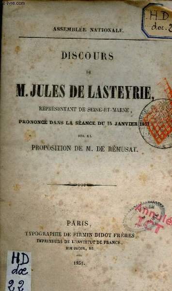 Discours de M.Jules de Lasteyrie repr�sentant de Seine et Marne prononc� dans la s�ance du 15 janvier 1851 sur la proposition de M.De R�musat. | Libri antichi e moderni | De Lasteyrie Jules