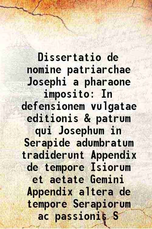 Dissertatio de nomine patriarchae Josephi a pharaone imposito In defensionem vulgatae editionis & patrum qui Josephum in Serapide adumbratum tradiderunt Appendix de tempore Isiorum et aetate Gemini Appendix altera de tempore Serapiorum ac passionis S 1696