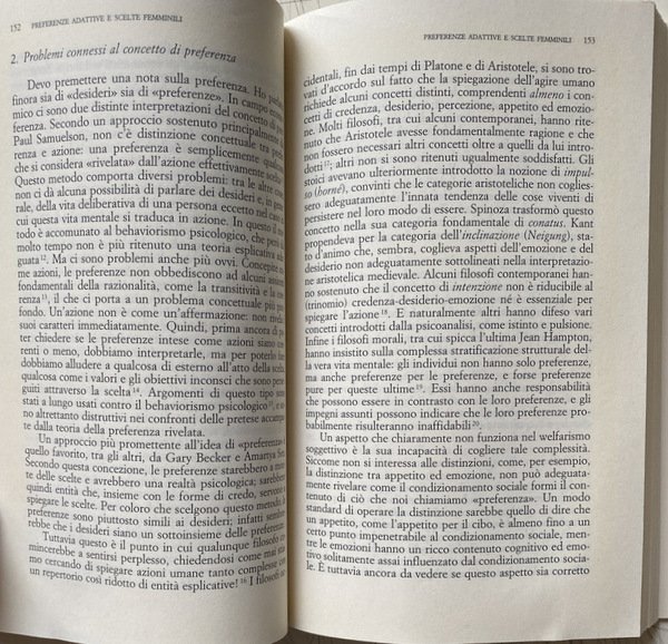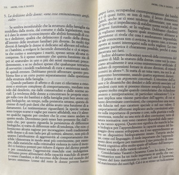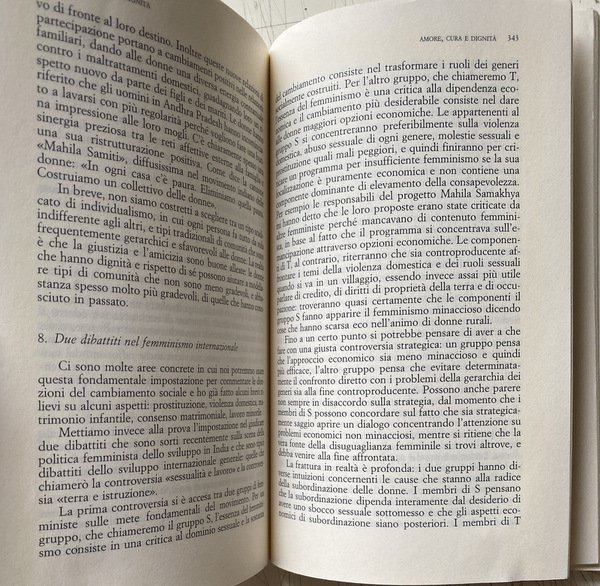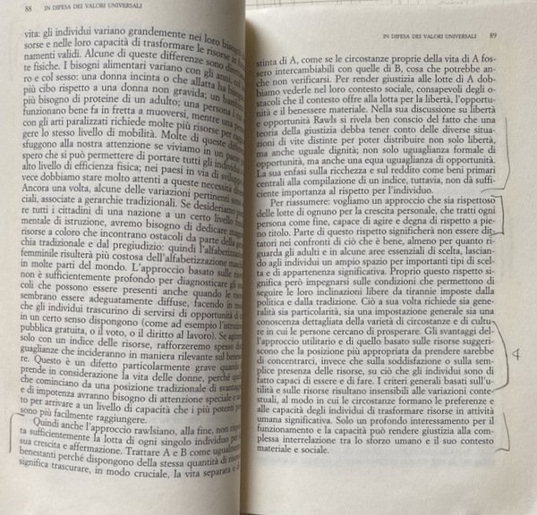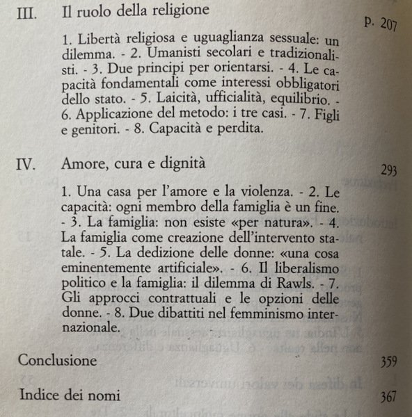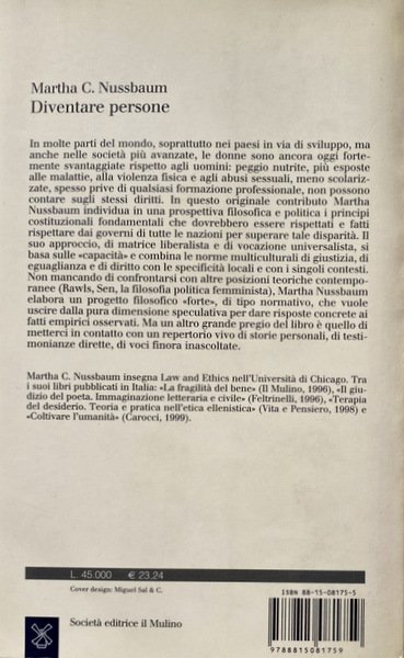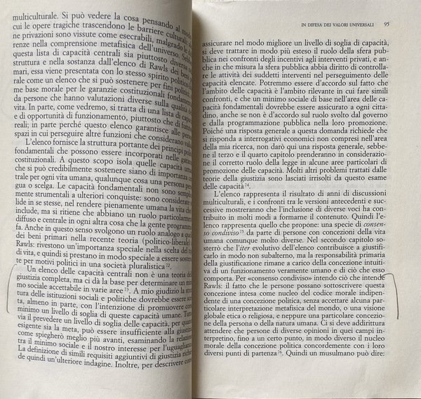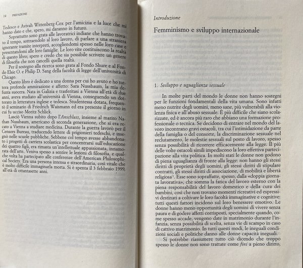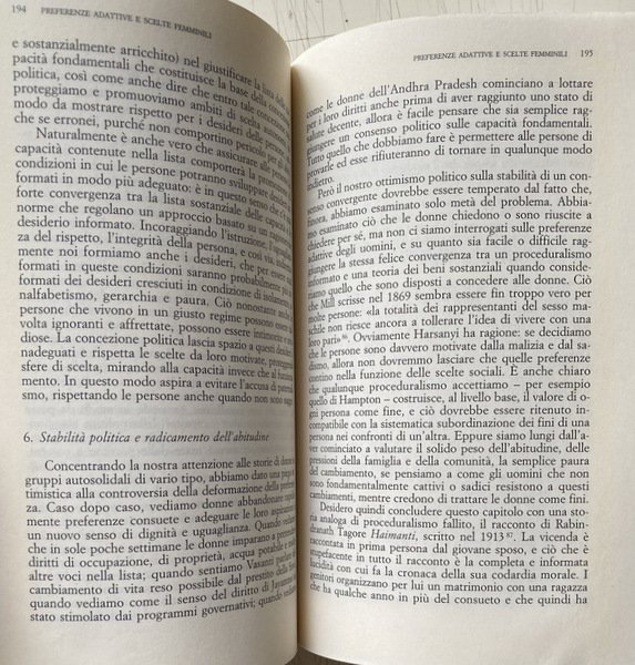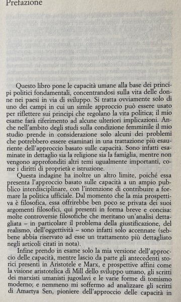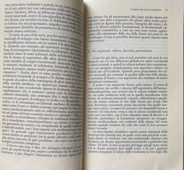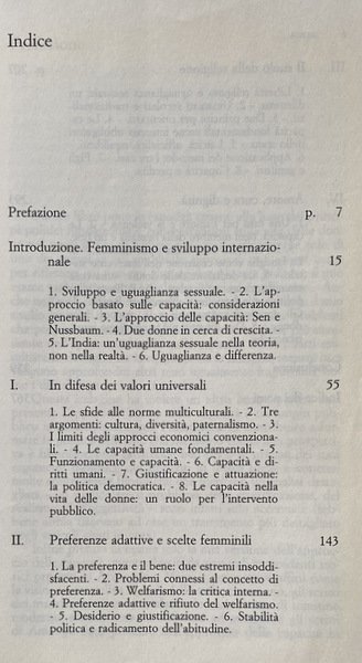 Soggetti: Filosofia morale, Etica, Psicologia, Etica, Politica, Società, Donne, Questioni femminili, Studi di Genere, Gruppi sociali, Istituzioni, Diritti umani, Propaganda, Controllo politico, Libertà, Diritto, Universalità, Parità di generi, Ruoli sociali, Cultura, Patriarcato, Matriarcato, Autoritarismo, Paternalismo, Minoranze, Donna, Femminismo, Lavoro, Scienze Umane, Sociologia, Persona oggetto, Saggistica, Giustizia sociale, Dignità umana, Intolleranza religiosa, Islam, Velo, Libertà di coscienza e religione, Human Development Report, Nazioni Unite, ONU, Teoria normativa, Tutela, Leggi, Governo, Principi universali, Costituzione, Discriminazioni sessuali, Condizione femminile, India, Capacità umane, Amartya Sen, Studi economici, Sviluppo, Teoria del funzionamento umano, Aristotele, Marx, Valore, Sussistenza, Relativismo culturale, Multiculturalismo, Critica, Consenso condiviso, John Rawls, Tradizioni diverse, Vita, Salute, Integrità fisica, Sensi, Immaginazione, Pensiero, Sentimenti, Povertà, Salario, Ragion pratica, Appartenenza, Ambiente, Gioco, Partecipazione politica, Possesso, Proprietà, Welfare, Benessere, Deformazione della preferenza, Selezione, Adattamento, John Harsanyi, Richard Brandt, John Elster, Henry Richardson, Paul Weithman, Cass Sunstein, Thomas Scanlon, Proceduralismo welfarista, Valori etici sostanziali, Conflitti, Religione, Uguaglianza sessuale, Famiglia, Tradizioni religiose, Oppressione, Discriminazione, Umanesimo femminista, Prescrizioni religiose, Principi normativi, Dialogo multiculturale, Giurisprudenza statunitense, America, Sentenze, Studi culturali, Donne indiane, Oltraggi, Violenza, Uomini, Preferenze adattive, Scelte, Prostituzione, Governance, Terzo mondo, Asia, Iran, Bangladesh, Cittadinanza, Rappresentanza, Mobilità, Sara Nussbaum, Agarwal, Bhatt, Brandt, Marthe Alter Chen, David Crocker, G.S. Becker, Harsaniy, J. Elster, Gandhi, Kant, Kokila, Habermas, Stuart Mill, Nehru, S.M. Okin, Tagore, Vidyasagar, A.K. Sen, Adam Smith, Salvatore Veca, B. Williams, Spinoza, Siegel, Thoreau, Tamir, Platone, Posner, Olsen, Lundberg, Marglin, K. Rose, Roy, Pandit, Mukhopadhyay, Bardhan, Laicità, Figli, Genitori, Liberalismo, Occidente, Europa, Tomismo, Umanisti jugoslavi, Controversie filosofiche, Libri Vintage Fuori catalogo, Riferimento, Bibliografia, Pedagogia, Buddhismo, Wider, Rajasthan, Kali, Nuova Delhi, Annapurna, Bombay, Onlus, Cina, Sudest Asiatico, Confronti, Qualità, Kenya, Pakistan, Zimbabwe, Africa, Honduras, Nascite, Procreazione, Reddito, PIL, Scolarizzazione, Secolarizzazione, Associazioni, Solidarietà femminile, Sacrificio, Parto, Morte, Condanne, Processi, Yarmulke, Esercito, Bob Jones, Infibulazione, Aborto, Divorzio, Moral Philosophy, Ethics, Psychology, Ethics, Politics, Society, Women, Women's Issues, Gender Studies, Social Groups, Institutions, Human Rights, Political Control, Freedom, Universality, Gender Equality, Social Roles, Culture, Patriarchy, Matriarchy, Authoritarianism, Paternalism, Minorities, Woman, Feminism, Work, Human Sciences, Sociology, Object Person, Nonfiction, Social Justice, Human Dignity, Religious Intolerance, Veil, Freedom of Conscience and Religion, United Nations, Normative Theory, Protection, Laws, Government, Universal principles, Constitution, Sexual discrimination, Female condition, Human skills, Economic studies, Development, Theory of human functioning, Aristotle, Value, Subsistence, Cultural relativism, Multiculturalism, Criticism, Shared consensus, Different traditions, Life, Health, Physical integrity, Senses, Imagination, Thought, Feelings, Poverty, Wage, Practical reason, Belonging, Environment, Game, Political participation, Po Sex, Property, Wellbeing, Preference deformation, Selection, Adaptation, Welfarist proceduralism, Substantial ethical values, Conflicts, Religion, Sexual equality, Family, Religious traditions, Oppression, Discrimination, Feminist humanism, Religious prescriptions, Normative principles, Multicultural dialogue, Jurisprudence American, Judgments, Cultural studies, Indian women, Outrages, Men, Adaptive preferences, Choices, Prostitution, Third world, Citizenship, Representation, Mobility, Secularism, Children, Parents, Liberalism, West, Europe, Thomism, Yugoslav humanists, Philosophical controversies, Out of print books, Reference, Bibliography, Pedagogy, New, China, Southeast, Comparisons, Quality, Births, Procreation, Income, GDP, Education, Secularization, Associations, Female solidarity, Violence, Sacrifice, Childbirth, Death, Sentences, Processes, Army, Infibulation, Abortion, Divorce