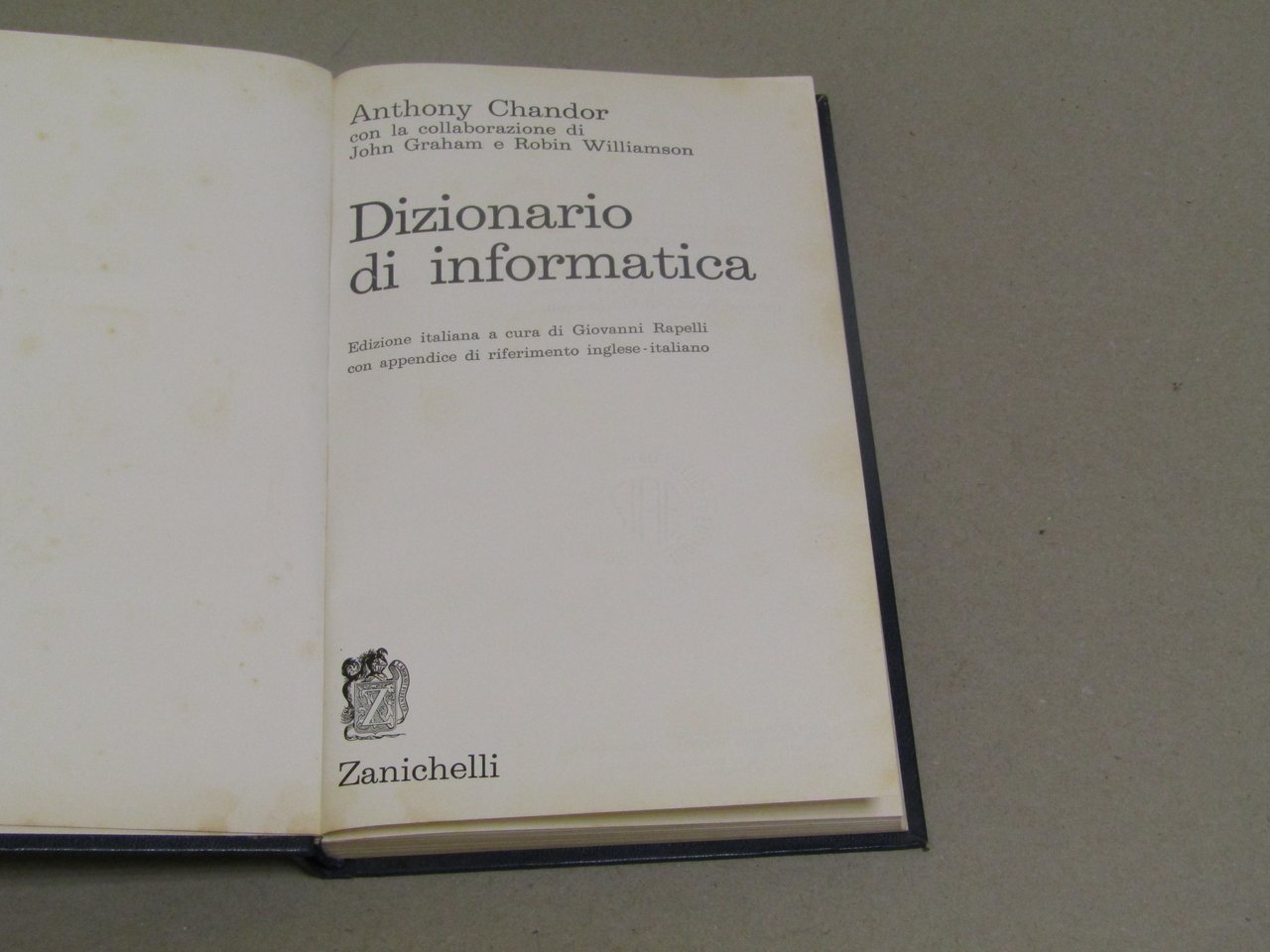 Anthony Chandor Dizionario di informatica. Bologna, Zanichelli 1978 - II italiano, in ottavo pp.354 Dizionario di termini informatici. Pagine leggermente ingiallite. Copertina cartonata.