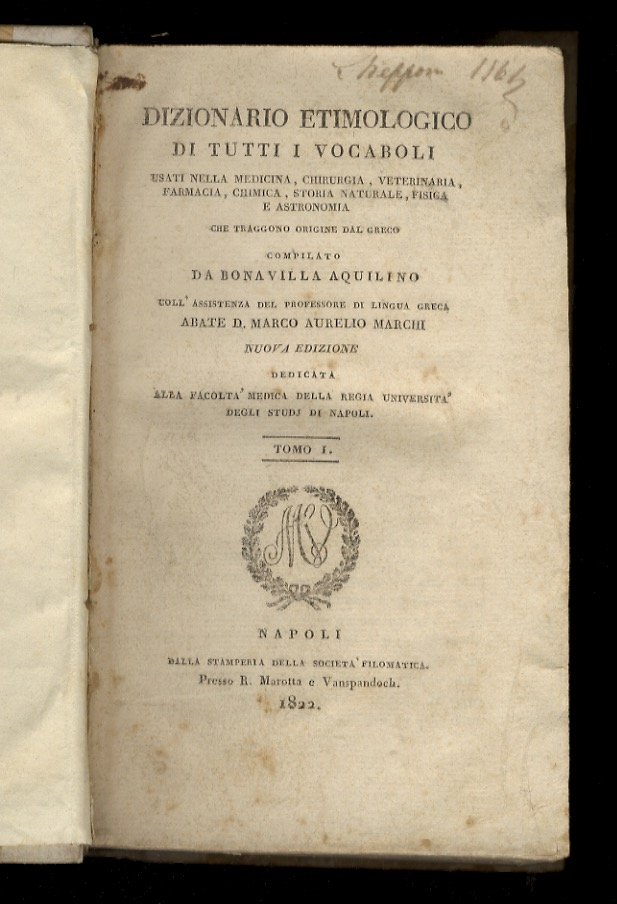 Dizionario etimologico di tutti i vocaboli usati nella medicina, chirurgia, veterinaria, farmacia, chimica, storia naturale, fisica e astronomia che traggono origine dal greco compilato da Bonavilla Aquilino coll'assistenza del professore di lingua greca abate D. Marco Aurelio Marchi. Nuova edizione dedicata alla facolta medica della Regia universita degli studi di Napoli. Tomo I. [-II.]