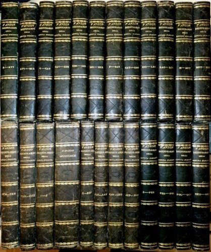 Prima edizione in 7 tomi + 1 di Appendice, raccolti in 24 volumi. (voll. 1-4, Tip. Sardi, voll. 5-12, Stamperia Vannini). Livorno, 1828,1842, 24 volumi. cm.14,5x21, pp.9500, Legatura in mz. pelle con piatti e tagli marmorizzati, fregi, titoli in oro ai dorsi. I tomi presentano i frontespizi per ciacun volume iniziale, quindi 7 frontespizi mentre i tomi successivi ai singoli volumim non hanno ovviamente i frontespizi in quanto non esistevano inizialmente. Ottimo esemplare completo. STATO: USATO, MOLTO BUONO.