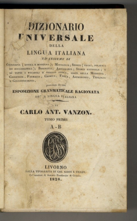 Dizionario Universale della Lingua Italiana ed insieme di Geografia (antica e moderna); Mitologia; Storia (sacra, politica ed ecclesiastica); Biografia; Antiquaria; Storia naturale; e di tutti i vocaboli d'origine greca, usati nella Medicina, Chirurgia, Farmacia, Chimica, Fisica, Astronomia, Teologia e Giurisprudenza. Preceduto da una Esposizione grammaticale ragionata della lingua italiana. Tomo Primo: A - B. | Libri antichi e moderni | Vanzon Carlo Antonio.