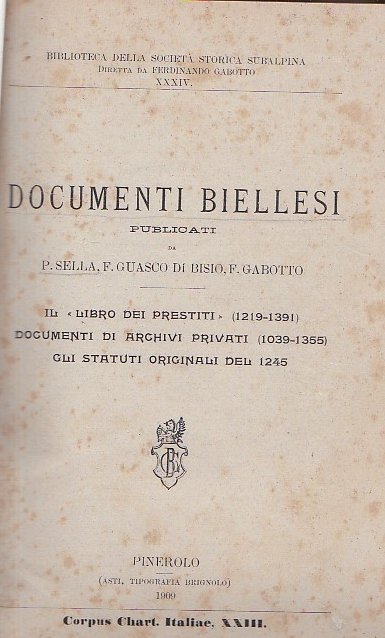 Documenti biellesi. Il 'Libro dei Prestiti' (1219 - 1391) - Documenti di archivi privati (1039 - 1355) - Gli statuti originali del 1245 | Libri antichi e moderni | Sella P. - Guasco Di Bisio F. - Gabotto F. (A Cura)